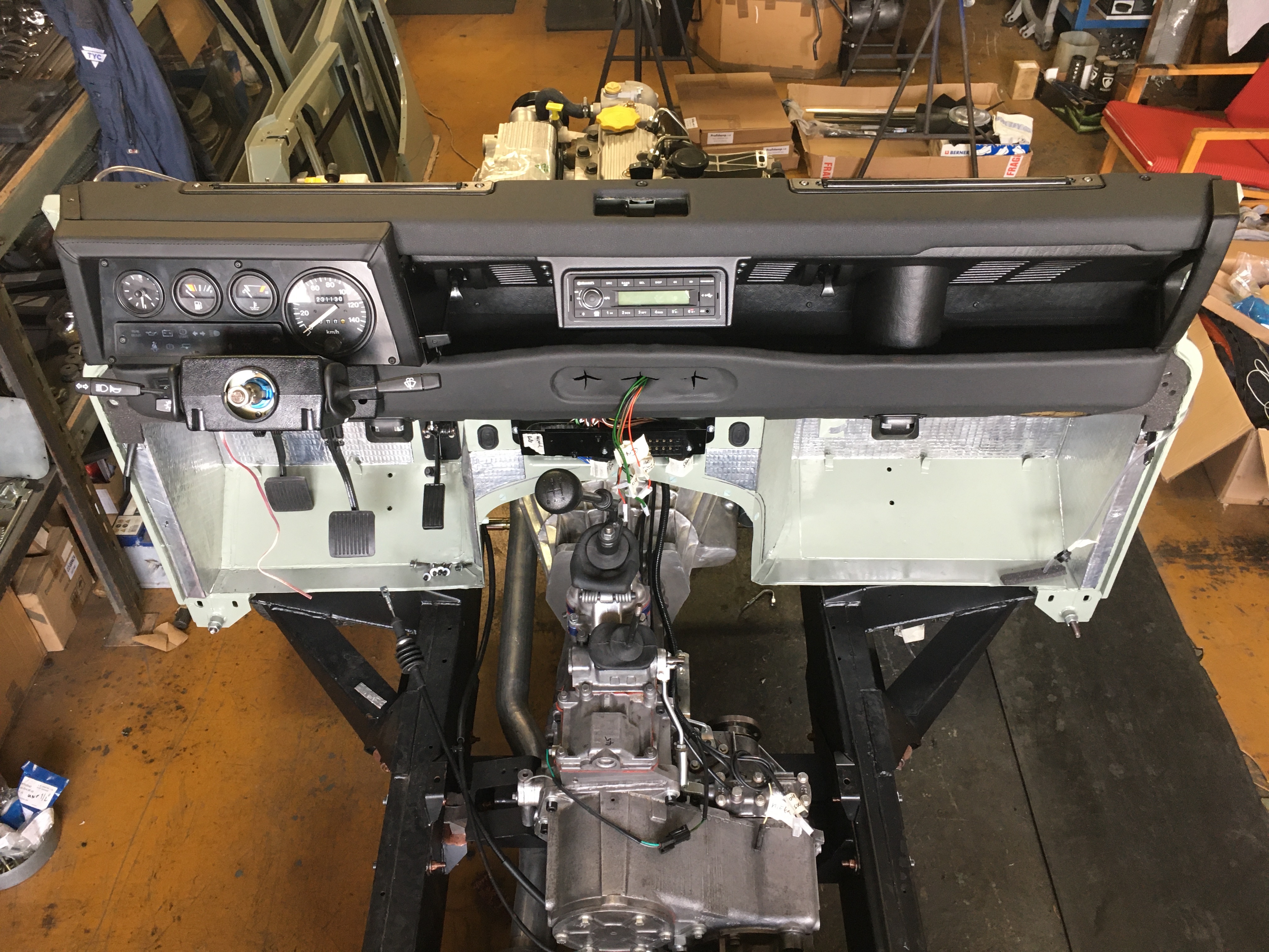nojo, na to jak malá je to plocha, by to chtělo jemnější texturu potahu, ale celkově super, já bych teda čekal, že palubovku budeš skládat až budeš mít zbytek auta hotovej (usazenej rám okna, střechu...) a ne jen takhle na bulkhead, ale asi to máš rozmyšlené.