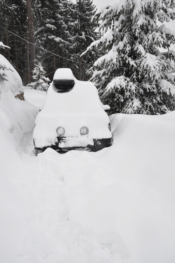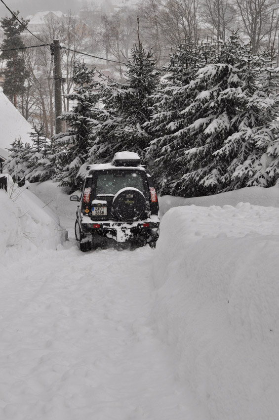 Tak jsem se v neděli před kupou malých dětí v autě chvástal, zda mám vyjet z parkoviště normální cestou nebo přes tu metrovou závěj. Všichni hlasovali pro závěj. No ještě, že mám naviják a přes silnici byla lampa pouličního osvětlení :). Pro caparty to byla velká zábava :oops: