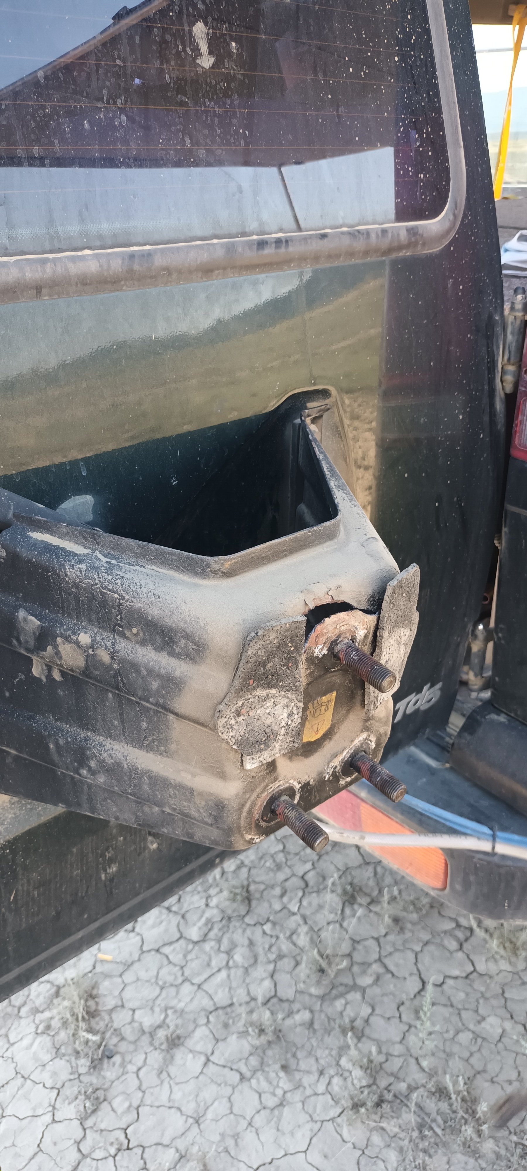 Po dvou dnech dodliva skákání po místních necestách v blízkosti hranic s Azerbajdžánem první větší problém - vytržený šroub držáku rezervy. Holt poté co je otočený vzhůru nohana kvůli větším kolům, a teď i s bednou to nedal. Naboucháno zpět kladivem, staženo kurtou a budene hledat nějaký servis se svářečkou.