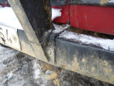 Zfackovanej je hlavne na prave strane (ve smeru jizdy), ale ve skutecnosti to, ze je tam nize je jen z pulky jeho vada. ja mam totiz napravo nize i samotne chassis po bouracce (auto je napravo asi o dva centimetry kratsi a ani vyska nesedi). Ale pohled zepredu snad napovi nejlepe. Dale pohled na uchyceni: na kazde strane dvema sroubama zvrchu skrez ram (chassis) a naraznik a pak dvema srobama zepredu narazniku jen k narazniku.