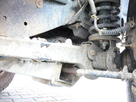 Další podezřelost byla, že "vzpěra" u nápravy (viz foto) byla u pravého kola ohoblovaná od pneumatiky do hloubky cca 3mm. Vypadá to jako by při plném rejdu drhla pneu o tu vzpěru. Pokud jsem vytočil plný na místě nic se nedotýkalo, otázka je jak to vypadá za jízdy. Nebo to mohlo vzniknoput před nějakou opravou - je vidět, že šrouby které drží v motorovém prostoru "domeček" kardanové tyče řízení byly povolované, takže něco se s řízením asi dělo.