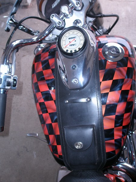 - na míru šité kožené brašny kopirující linii blatníku + kožená rolka + kožený pás na nádrži atd.