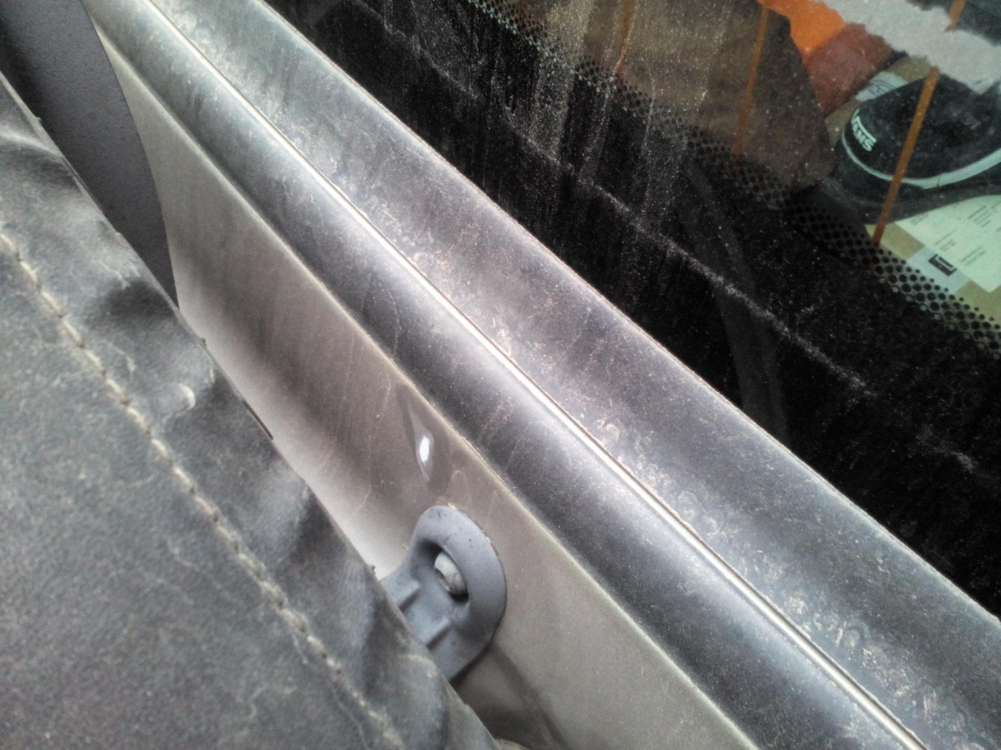 Chce to nový ramínko stěrače... Ono se asi časem prostě prověsí a zavazí o dveře. Originál ramínko. Kupoval jsem náhražku z polska (ebay) a silně nedoporučuji... Jednak tam byla krátká hadička k ostřikovači, takže ať jsem to dal jak jsem chtěl, tahal se celý šlauch přes uchycení stěrače k motorku. Jednak tam bylo slabší pérko, takže to ani pořádně nestíralo, starší péro nešlo použít vzhledem k trošku rozdílnýmu provedení origo vs. polskýho stěrače. Ani trysky nebyly stejný... Navíc po několika pokusech nandat a sundat ten stěrač polskej se jednoduše v tom ohýbacím spoji zlomil... Zatím jsem tam dal samolepku aby se dveře nedřely ještě víc a jak budu objednávát oleje, přihodím k tomu nový ramínko stěrače za cca 600...