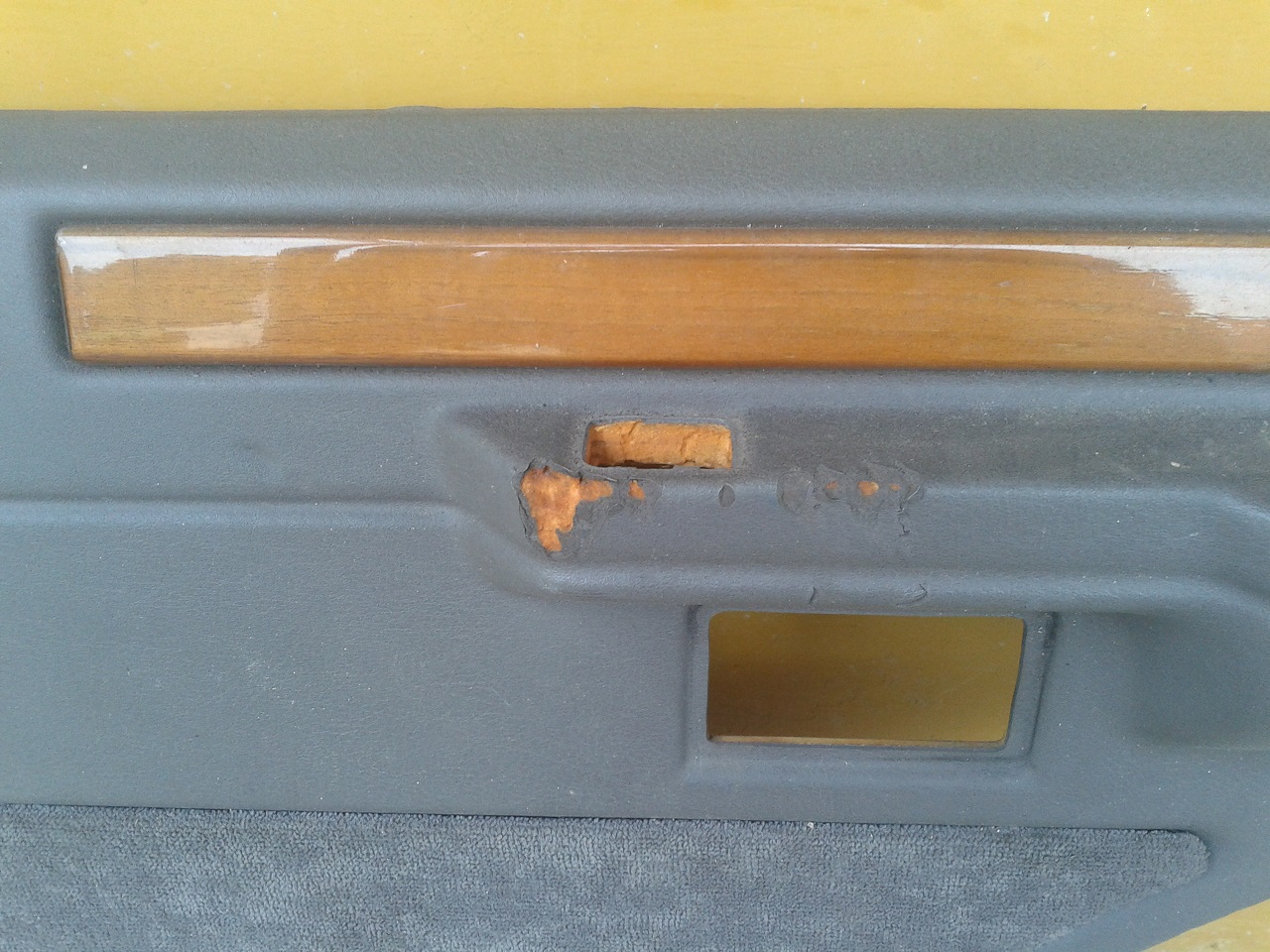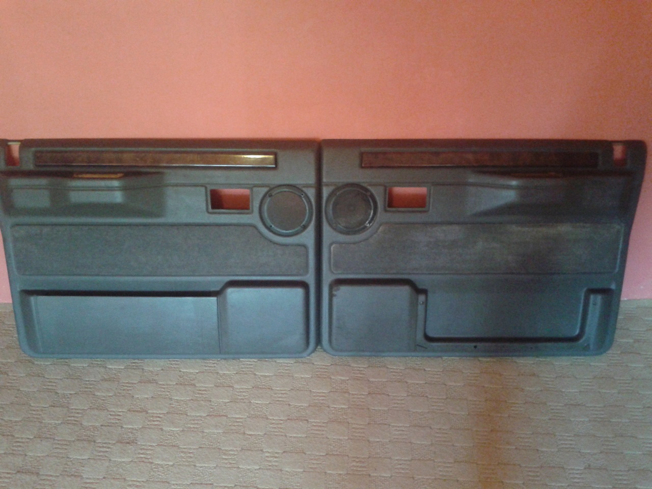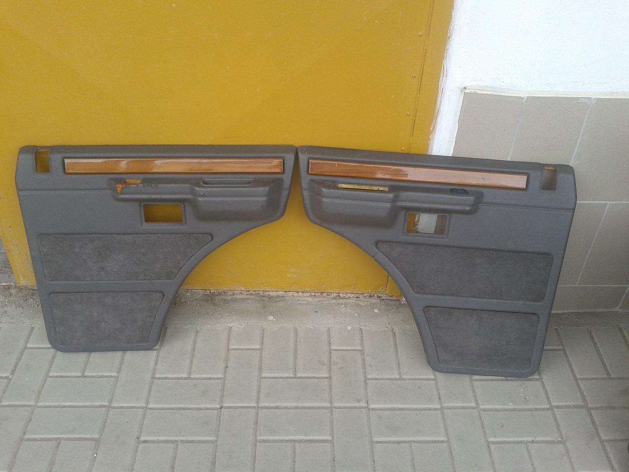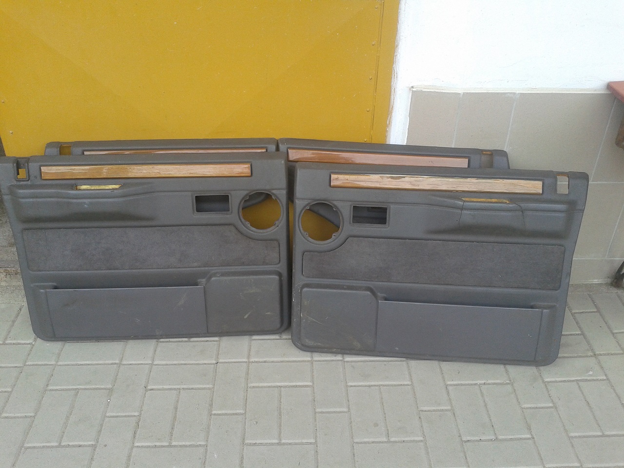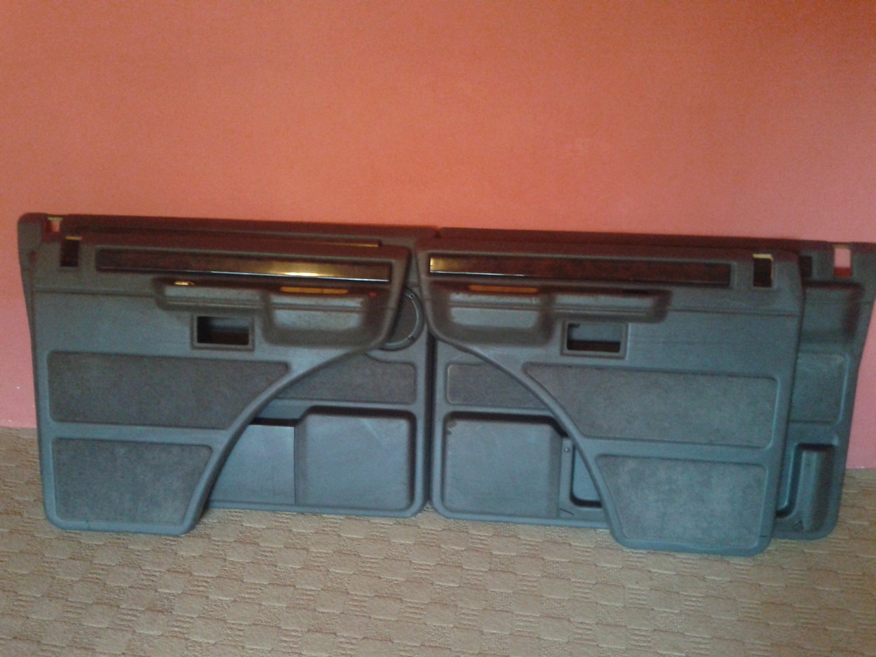 Tapecíry do dveří - novější model ( tzn. bez toho kusu pravého dřeva nahoře ), horší stav - jeden je naprasklý, místy odřené, včetně kliček, madel, kolíků, .... prodano