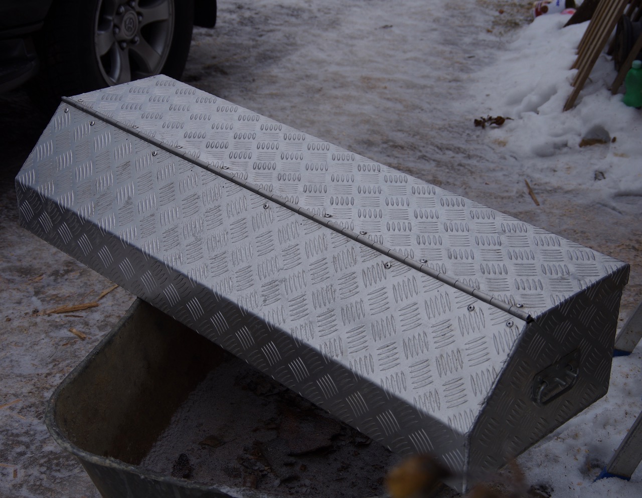 Takže 1) Alu box, který jsem nechal vyrábět z kapkového 3mm plechu, klavírák taktéž alu s nerezovou osičkou, dva sklopné držáky na bocích, uvnitř odnímatelná přepážka, vyroben na míru na zadní blatník u 110-ky (délka ca.107cm).