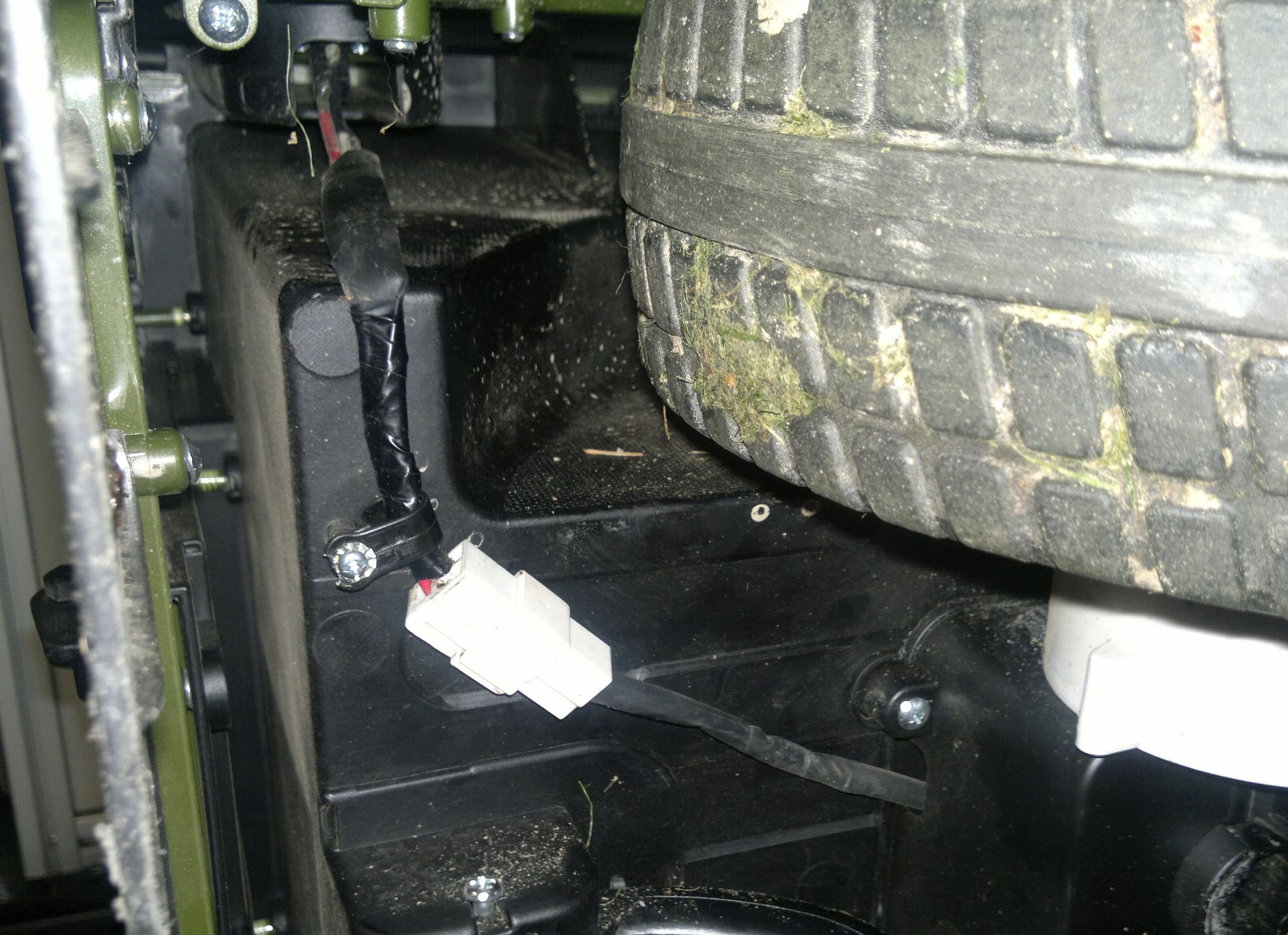 Tady už je učesaná nová kabeláž. Původní silové vodiče AWG18 (0,8mm2) vedoucí od aku k vypínači a zpět k řídící desce (a plus ty kostrové od aku k desce) jsem nahradil vodiči AWG12 (3,3mm2). Už dříve jsem na těch původních měřil za jízdy úbytky a nic významného jsem nenaměřil, takže jsem očekával hlavně přínos v mechanické odolnosti tlustších drátů. Když už jsem to dělal a byly po ruce... no ale ukázalo se, že to má sakra vliv. Defík je teď živější, hravješ vyjede kopečky na zahradě a je i vidět na palubním multimetru, že napětí v záběru nepadá tak dramaticky jako dřív. A to jsou tam pořád starší jeté akumulátory.