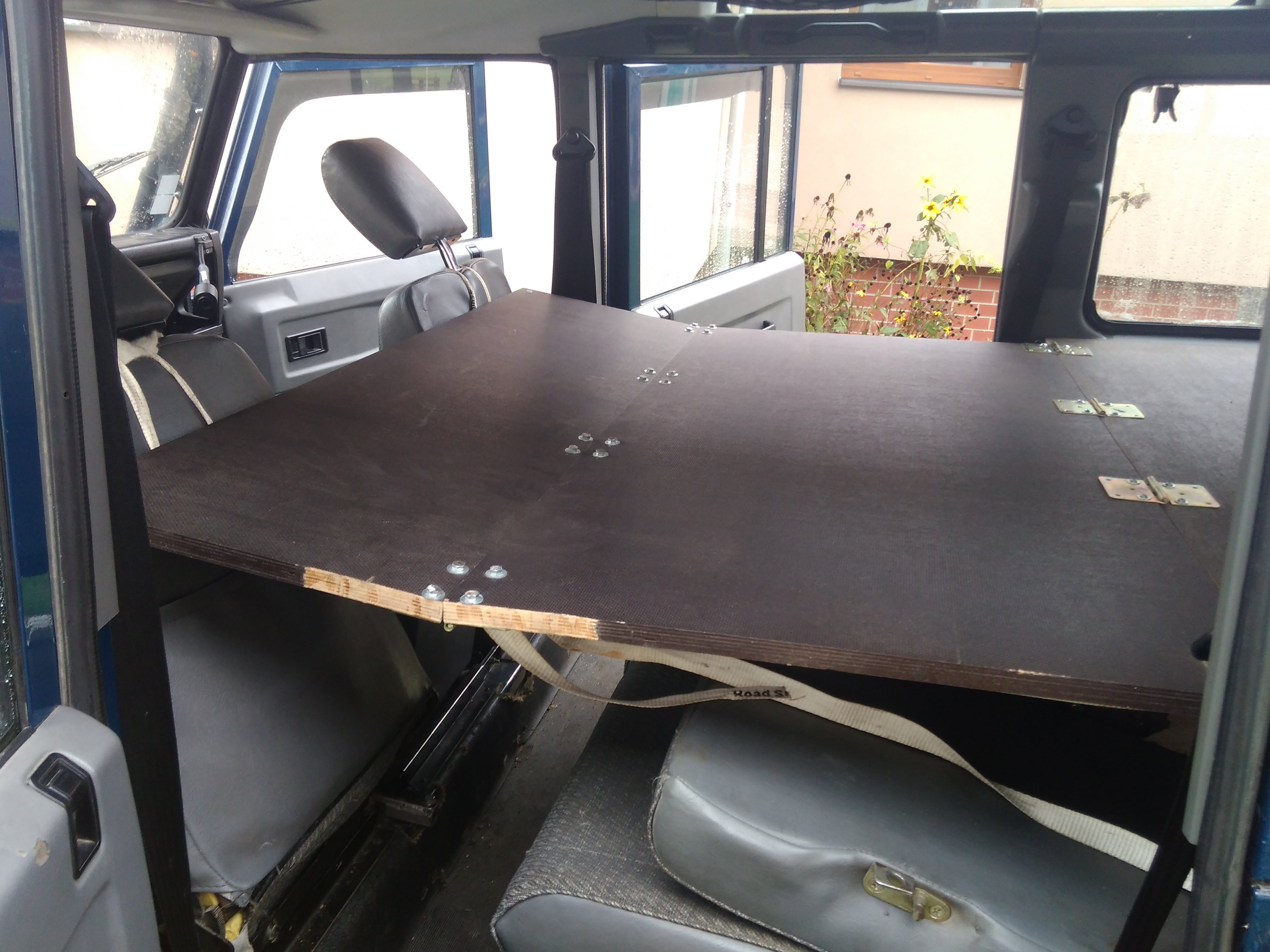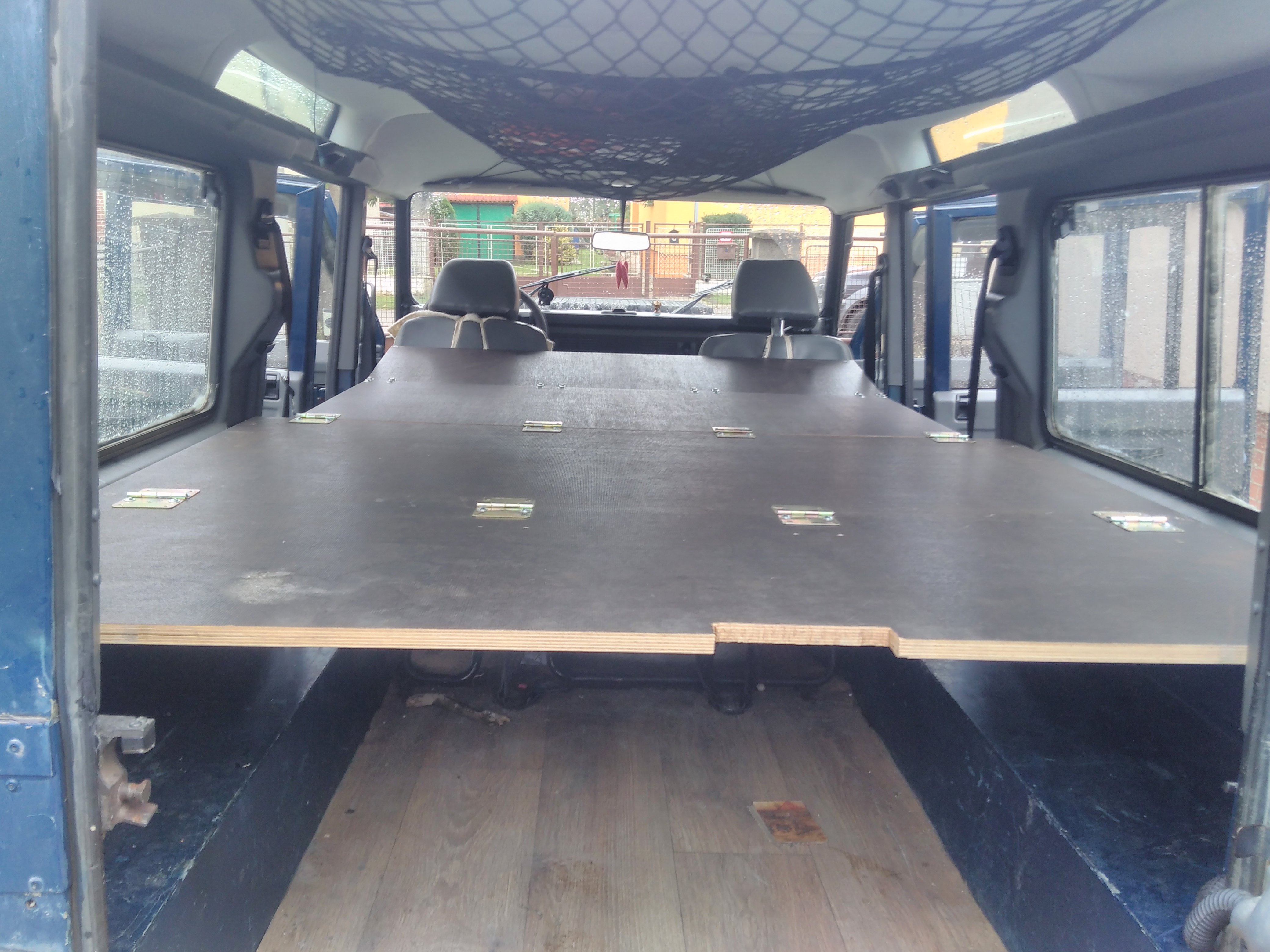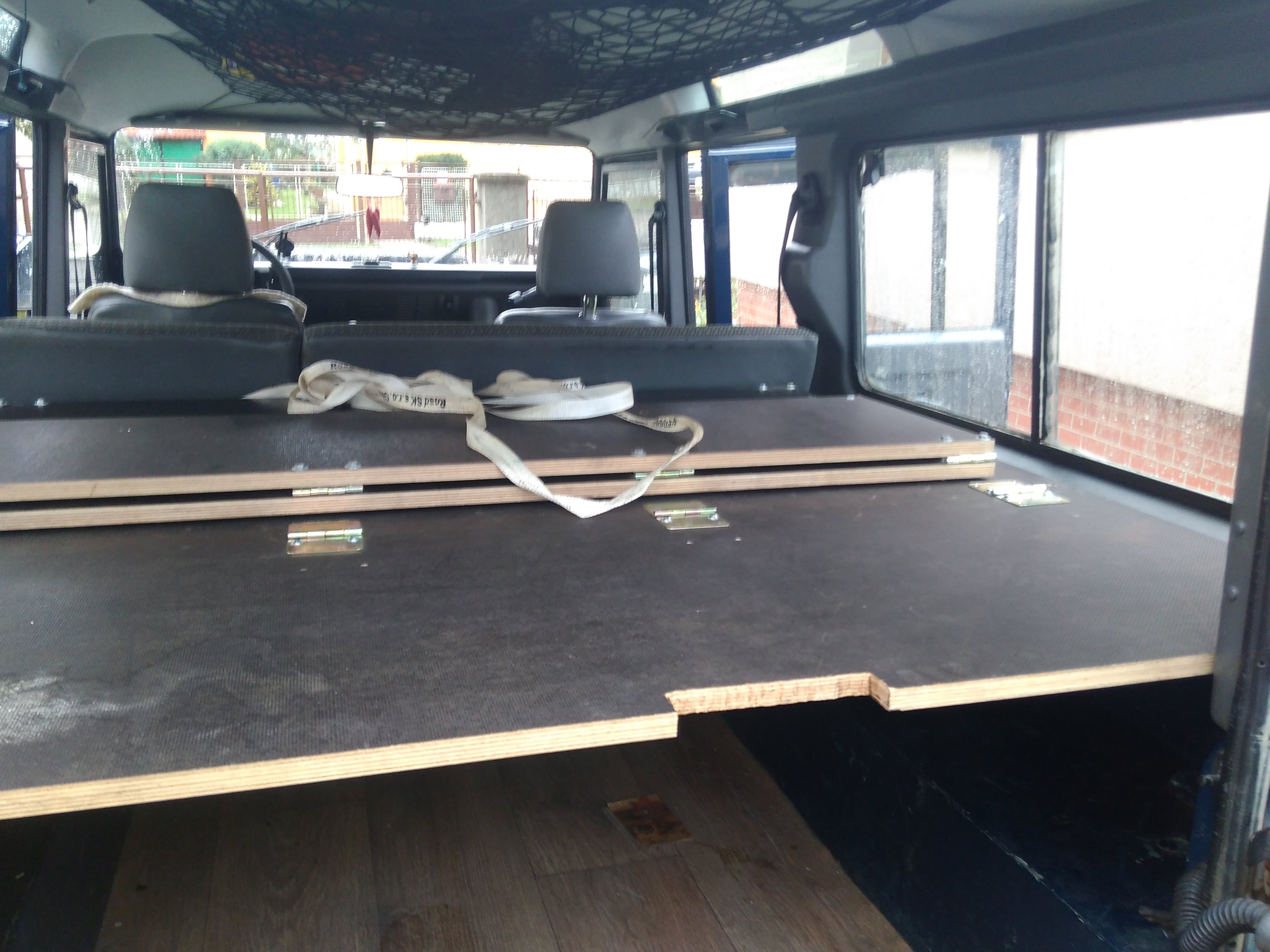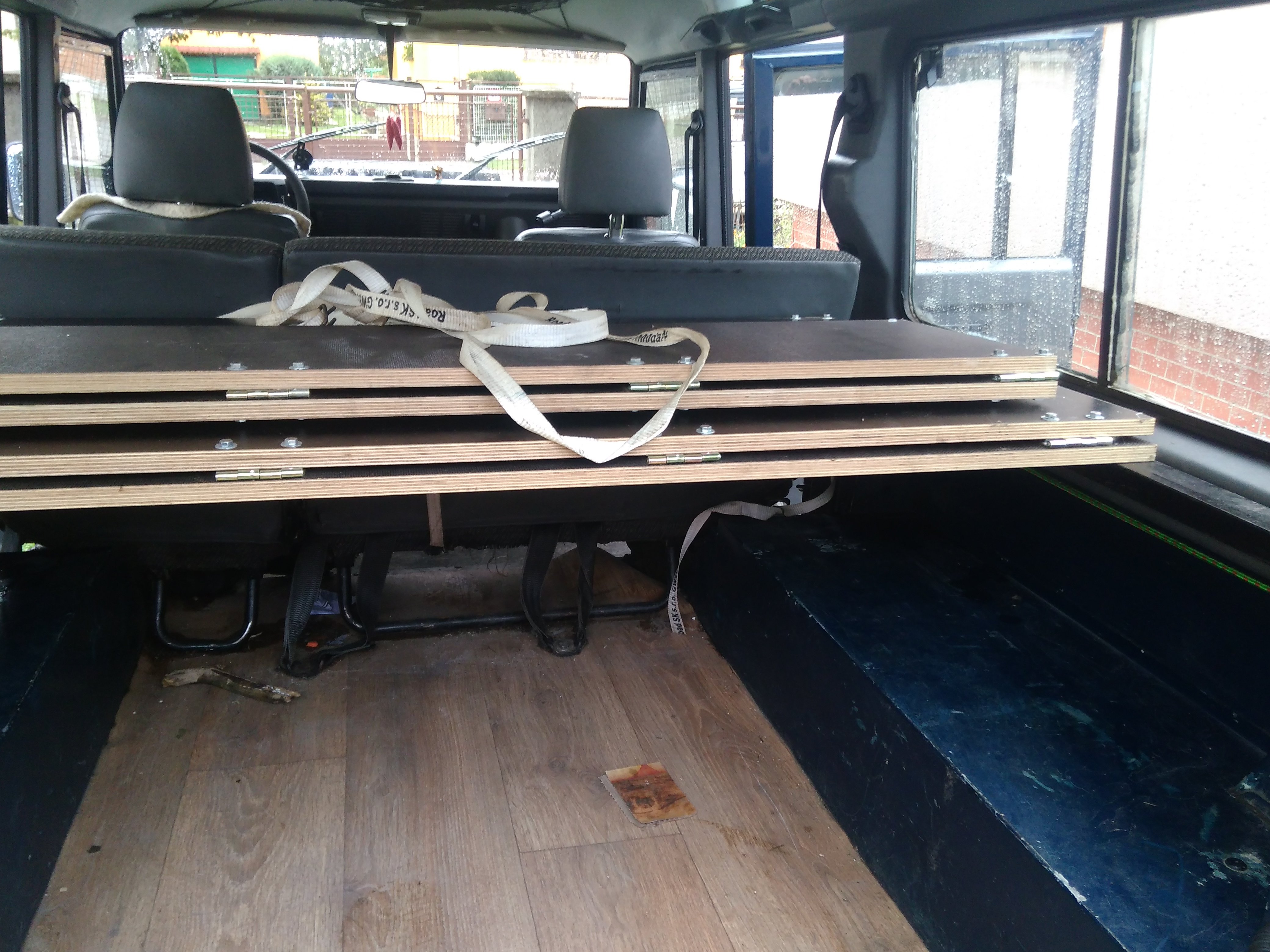 Nazdar tak ponukam spane do defendra 110 300tdi sw. Je upevnene na konzolach ktore su priskrutkovane na bokoch takze nezavadzaju ziadne nozicky. V zakladnej polohe je to plato na velu plochu kufra. Polovica plata sa da preklapat. Dalsia poloha je cele plato s oddelovacou prepazkou medzi sedadalami a kufrom super vec ked potrebujem nalozit az po strop. Samozrejme je mozne mat polplato s oddelovacou prepazkou. Treba este doriesit uchytenie v polohe prepazky. Ja som to mal uchytene v strope tam mam miesto plastovych culpikov zavitovu vlozku a naskrutkovane ocko. Potom je poloha postel pricom podperu poslednej casti robia popruhy pretoze som opat nechcel nozicky ktore by mi zavazdali. Odskusane to je pre dve dospele osoby a dve deti. Tetaz mame karavan a psa takze spime v karavane a kvoli klietke pre psa tam nemontujem postel. Material je vodeodolna preglejka 18mm take netreba ziadne vystuhy sama je dost pevna. Chcem za to 150€ je v tom iba matros za 120€ a nejake phm a cosi na kavu.